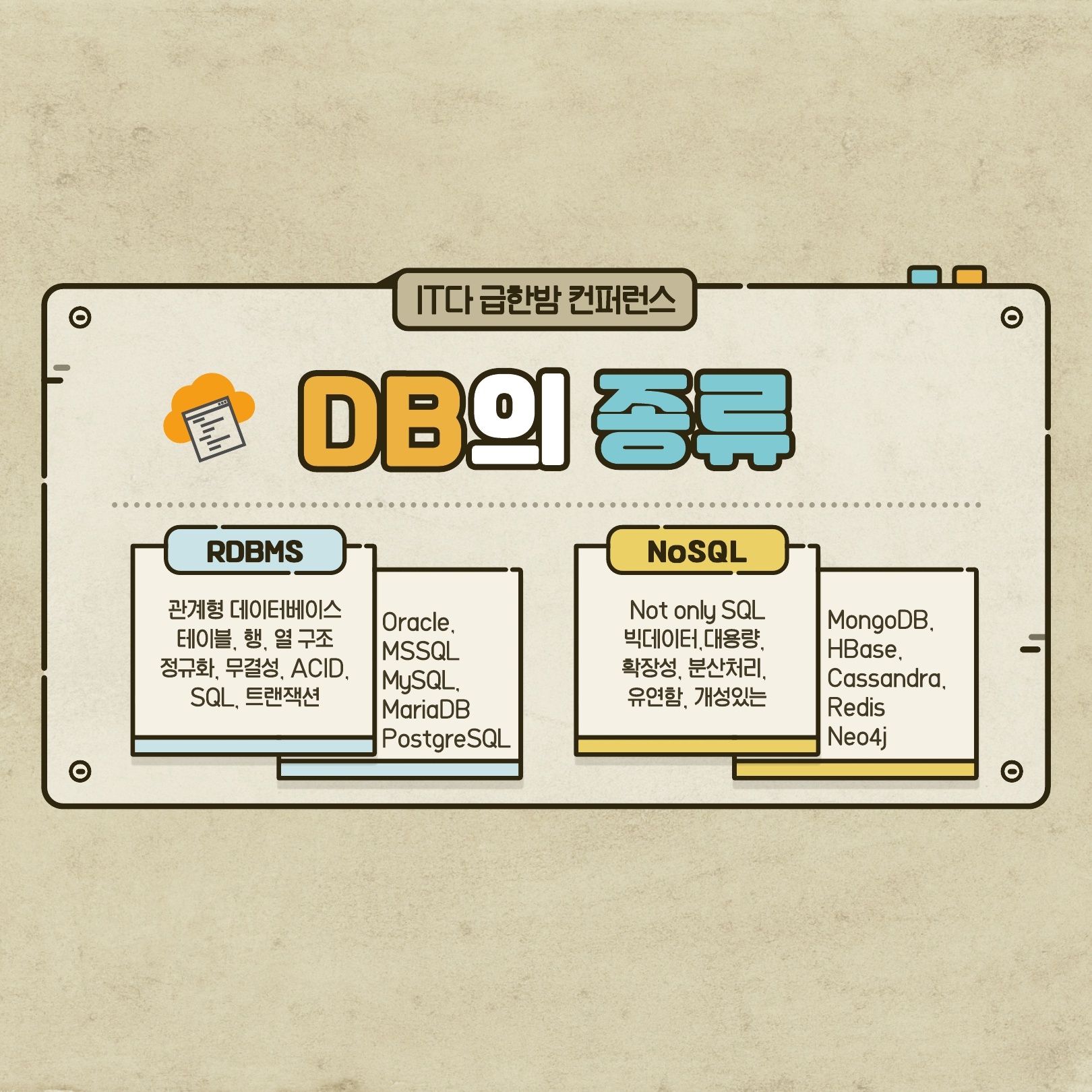 Full Managed 서비스가 많아지는 지금, 넓고 얕게, 다양한 기종에 대한 이해도를 올리는 편이 특정한 서비스를 설계하는데 있어 효율적으로 데이터베이스를 이용 할 수 있다고 생각되기 때문입니다. 그러기 위해서는 클라우드도 좀 알아둬야하고… 다른 회사는 어떤 기술을 쓰나 관심도 둬야 하고, 개발을 하다 보면 RDBMS만으로는 한계에 부딪히는 상황이 반드시 옵니다.